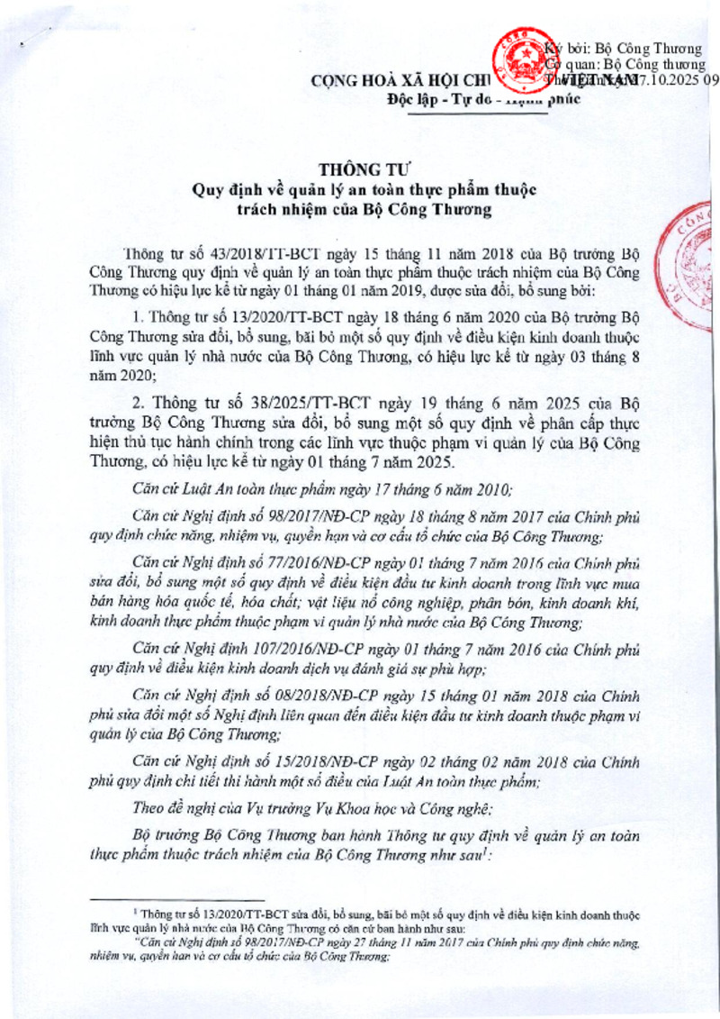 | Tiêu đề văn bản | Văn bản hợp nhất số 52/VBHN-BCT ngày 24/10/2025 - Thông tư quy định về quản lý an toàn thực phẩm thuộc trách nhiệm của Bộ Công Thương | ||