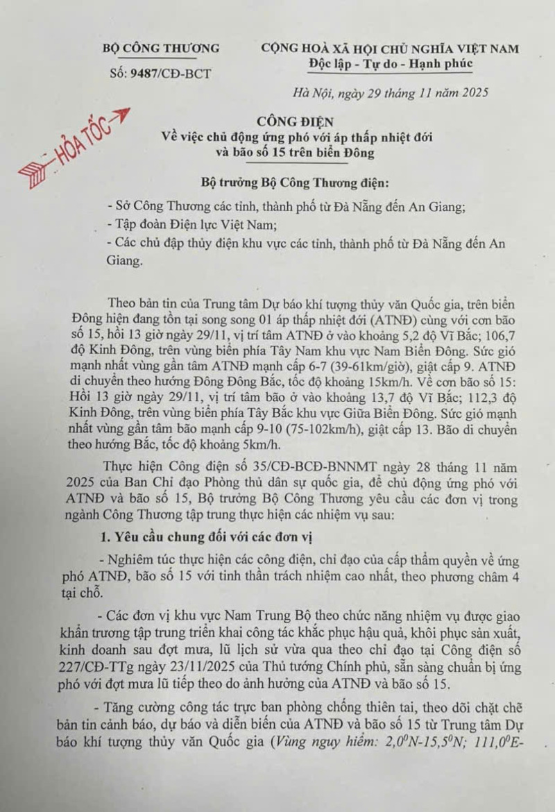 | Tiêu đề văn bản | Công điện về việc chủ động ứng phó với áp thấp nhiệt đới và bão số 15 trên biển Đông | ||