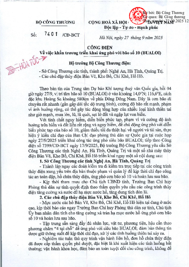 Tiêu đề văn bản | Công điện về việc khẩn trương triển khai ứng phó với bão số 10 (BUALOI) | ||