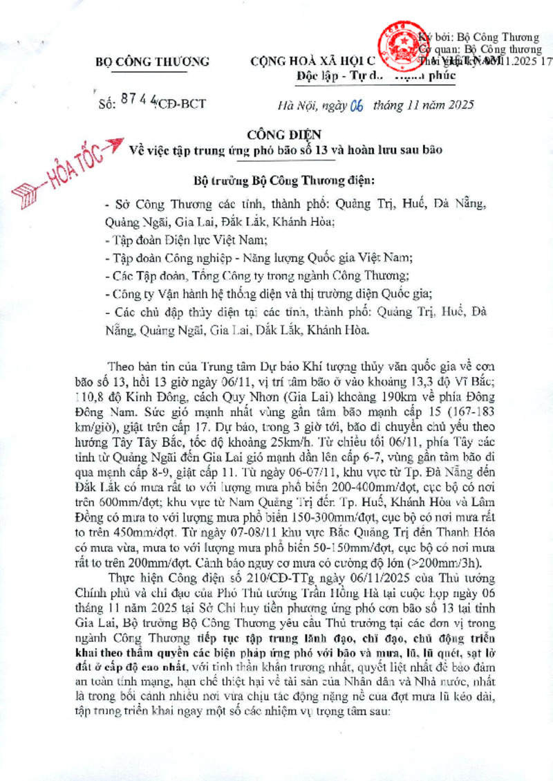 | Loại tài liệu | Công điện | Người ký | Bộ trưởng Nguyễn Hồng Diên |