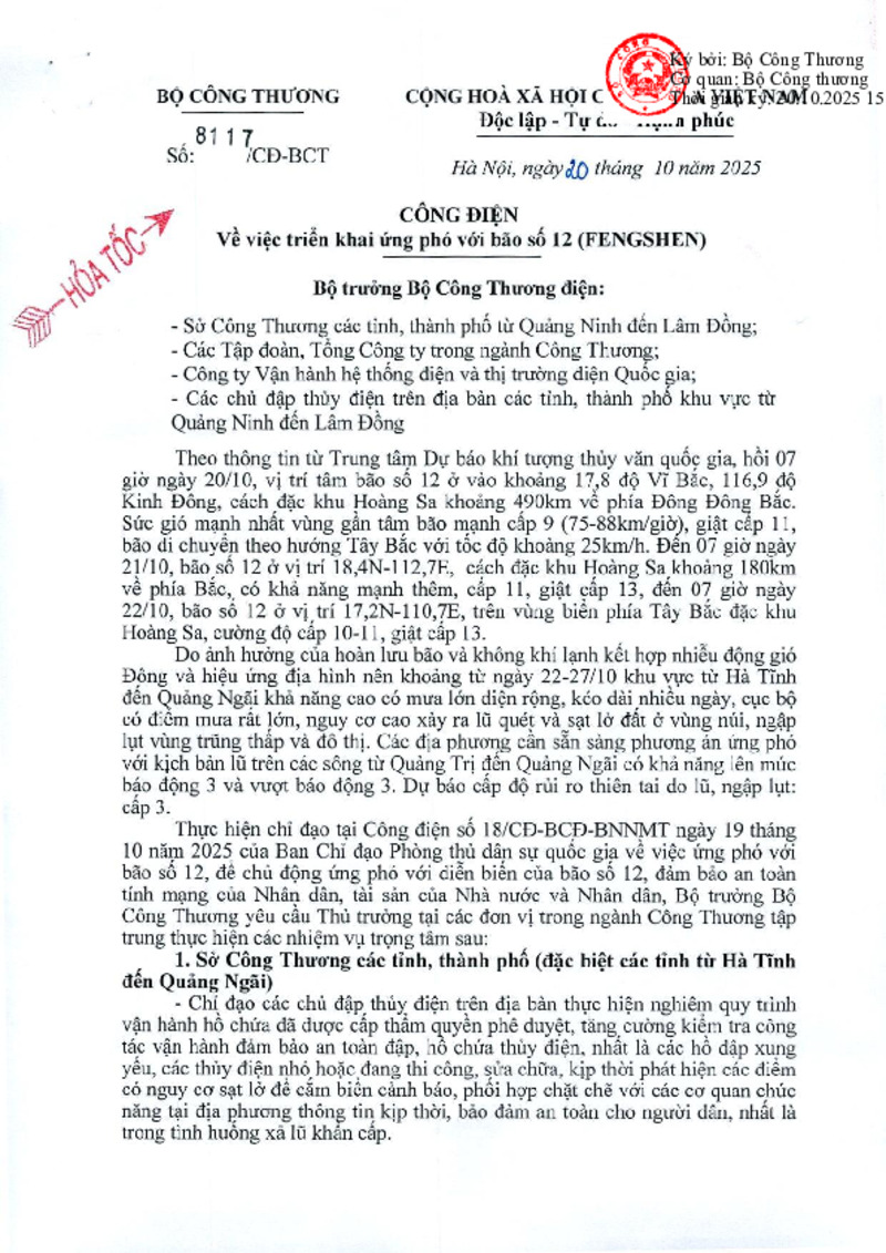 | Tiêu đề văn bản | Công điện về việc triển khai ứng phó với bão số 12 (FENGSHEN) | ||