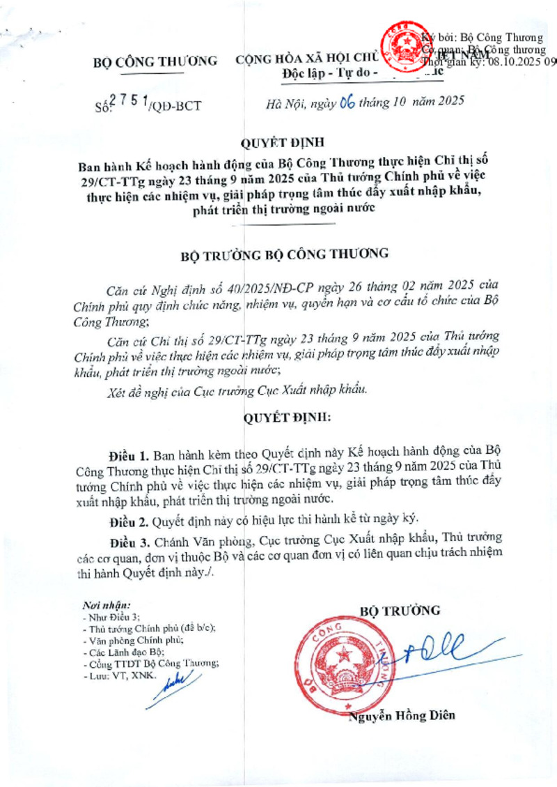 Tiêu đề văn bản | Quyết định ban hành Kế hoạch hành động của Bộ Công Thương thực hiện Chỉ thị số 29/CT-TTg ngày 23/9/2025 của Thủ tướng Chính phủ về việc thực hiện các nhiệm vụ, giải pháp trọng tâm thúc đẩy xuất nhập khẩu, phát triển thị trường ngoài nước | ||