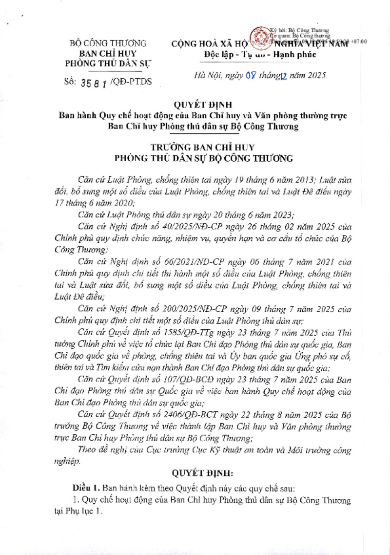 | Tiêu đề văn bản | Quyết định ban hành Quy chế hoạt động của Ban Chỉ huy và Văn phòng thường trực Ban Chỉ huy Phòng thủ dân sự Bộ Công Thương | ||