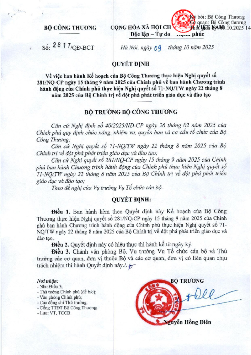 Tiêu đề văn bản | Quyết định về việc ban hành Kế hoạch của Bộ Công Thương thực hiện Nghị quyết số 281/NQ-CP ngày 15/9/2025 của Chính phủ về ban hành Chương trình hành động của Chính phủ thực hiện Nghị quyết số 71-NQ/TW ngày 22/8/2025 của Bộ Chính trị về đột phá phát triển giáo dục và đào tạo | ||