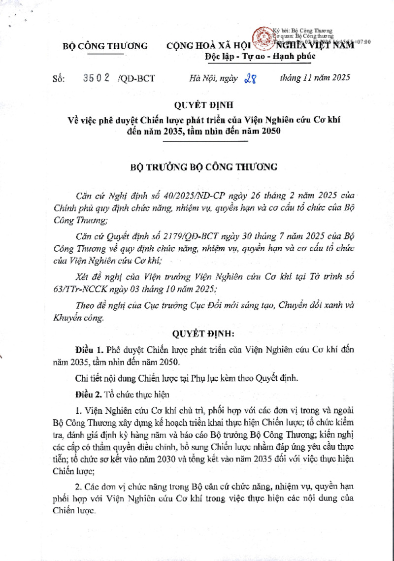 | Tiêu đề văn bản | Quyết định về việc phê duyệt Chiến lược phát triển của Viện Nghiên cứu Cơ khí đến năm 2035, tầm nhìn đến năm 2050 | ||