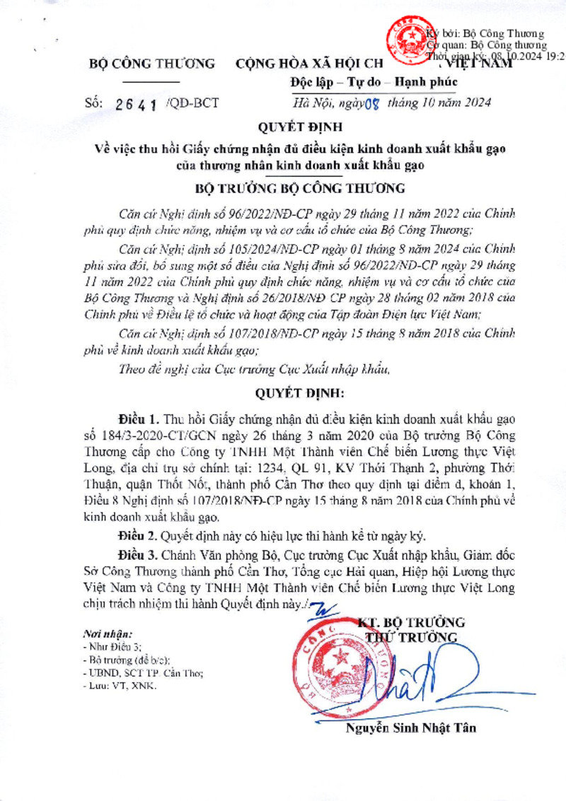 | Tiêu đề văn bản | Quyết định về việc thu hồi giấy chứng nhận đủ điều kiện kinh doanh xuất khẩu gạo của thương nhân kinh doanh xuất khẩu gạo | ||