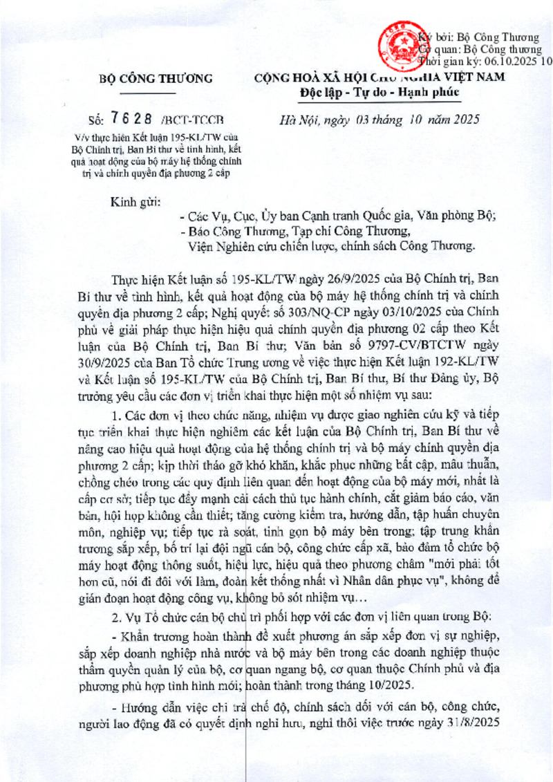 Ngày 3/10/2025, Bộ Công Thương ban hành văn bản số 7628/BCT-TCCB về việc thực hiện Kết luận 195-KL/TW của Bộ Chính trị, Ban Bí thư về tình hình kết quả hoạt động của bộ máy hệ thống chính trị và chính quyền địa phương 2 cấp.