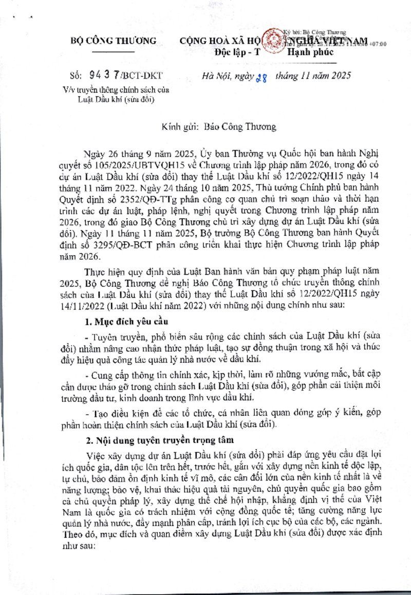 | Tiêu đề văn bản | Văn bản số 9437/BCT-DKТ về việc truyền thông chính sách của Luật Dầu khí (sửa đổi) | ||