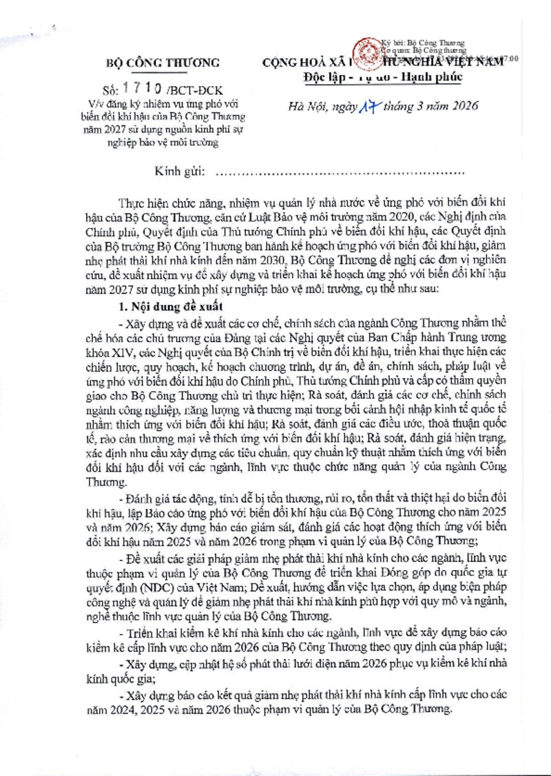 | Tiêu đề văn bản | Văn bản về việc đăng ký nhiệm vụ ứng phó với biến đổi khí hậu của Bộ Công Thương năm 2027 sử dụng nguồn kinh phí sự nghiệp bảo vệ môi trường | ||