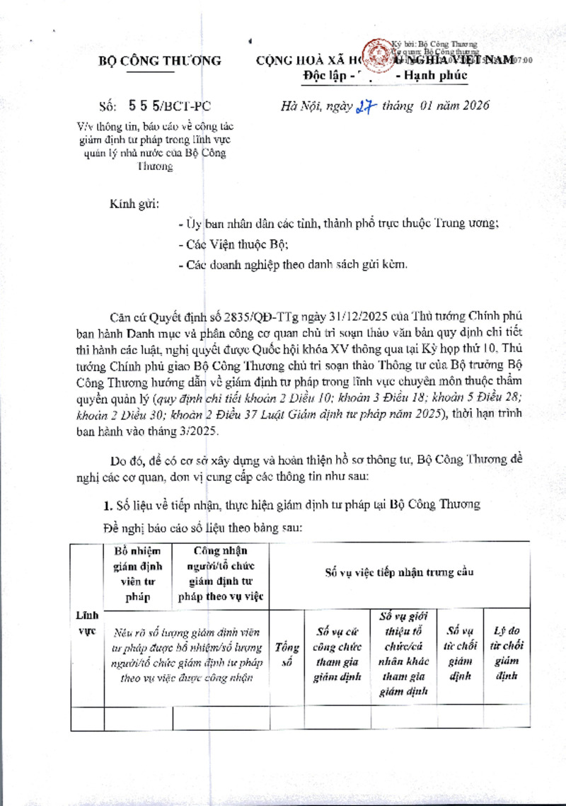 | Tiêu đề văn bản | Văn bản về việc thông tin, báo cáo về công tác giám định tư pháp trong lĩnh vực quản lý nhà nước của Bộ Công Thương | ||