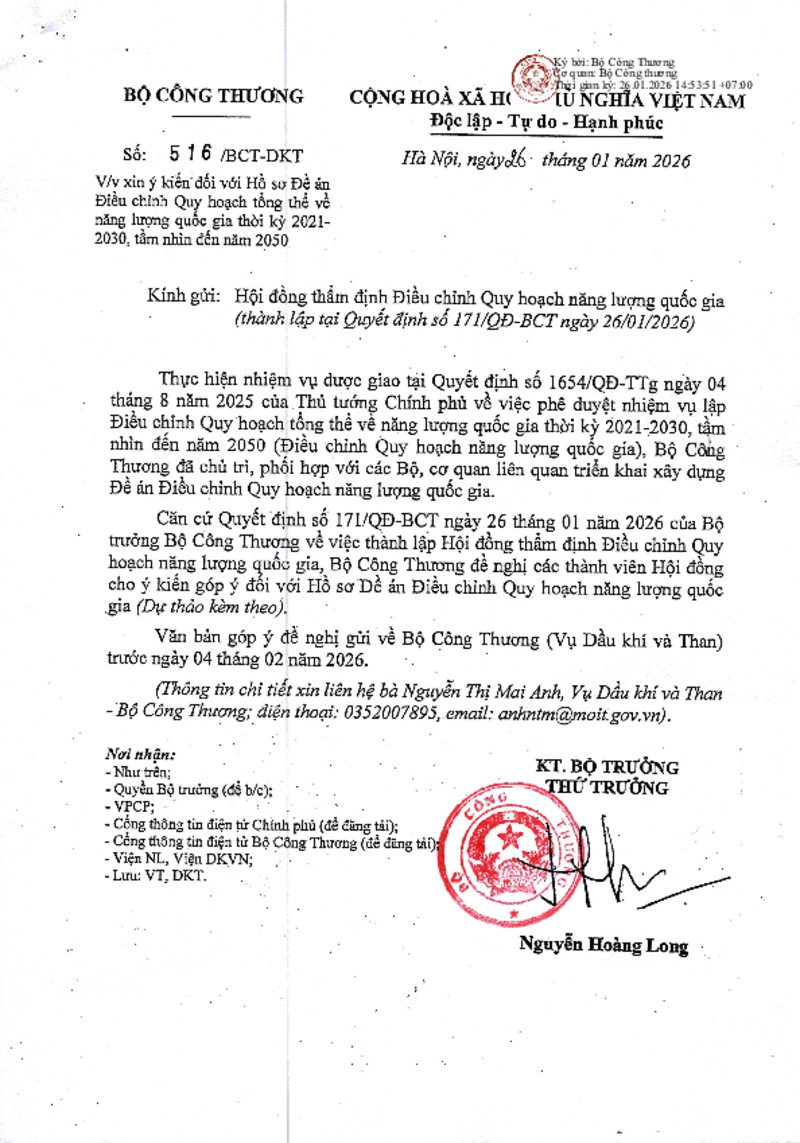 | Tiêu đề văn bản | Văn bản về việc xin ý kiến đối với Hồ sơ Đề án Điều chỉnh Quy hoạch tổng thể về năng lượng quốc gia thời kỳ 2021 - 2030, tầm nhìn đến năm 2050 | ||