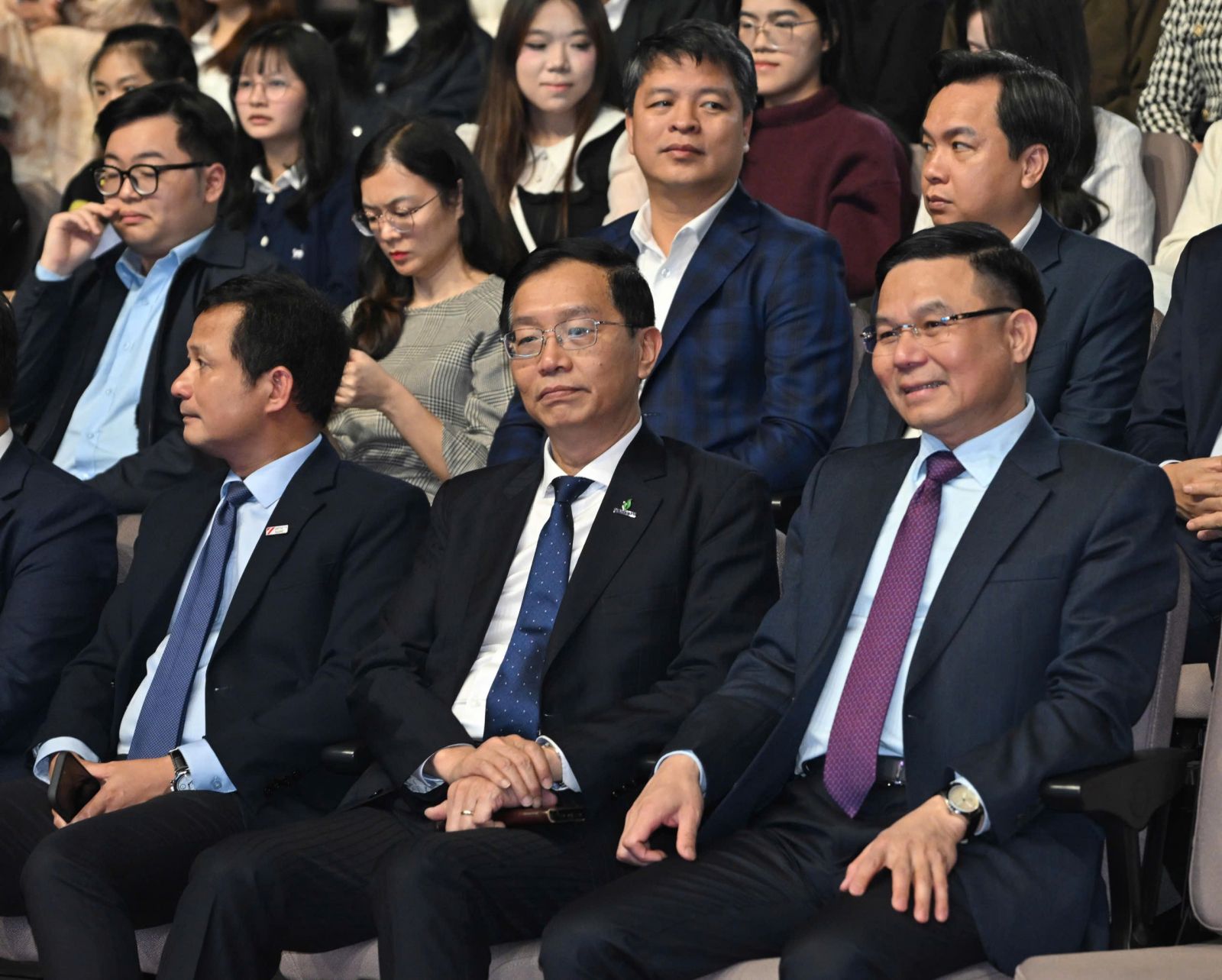 Đồng chí Lê Mạnh Hùng - Ủy viên Ban Chấp hành Trung ương Đảng, Bí thư Đảng ủy, Quyền Bộ trưởng Bộ Công Thương, lãnh đạo Petrovietnam chụp ảnh cùng học sinh, sinh viên.