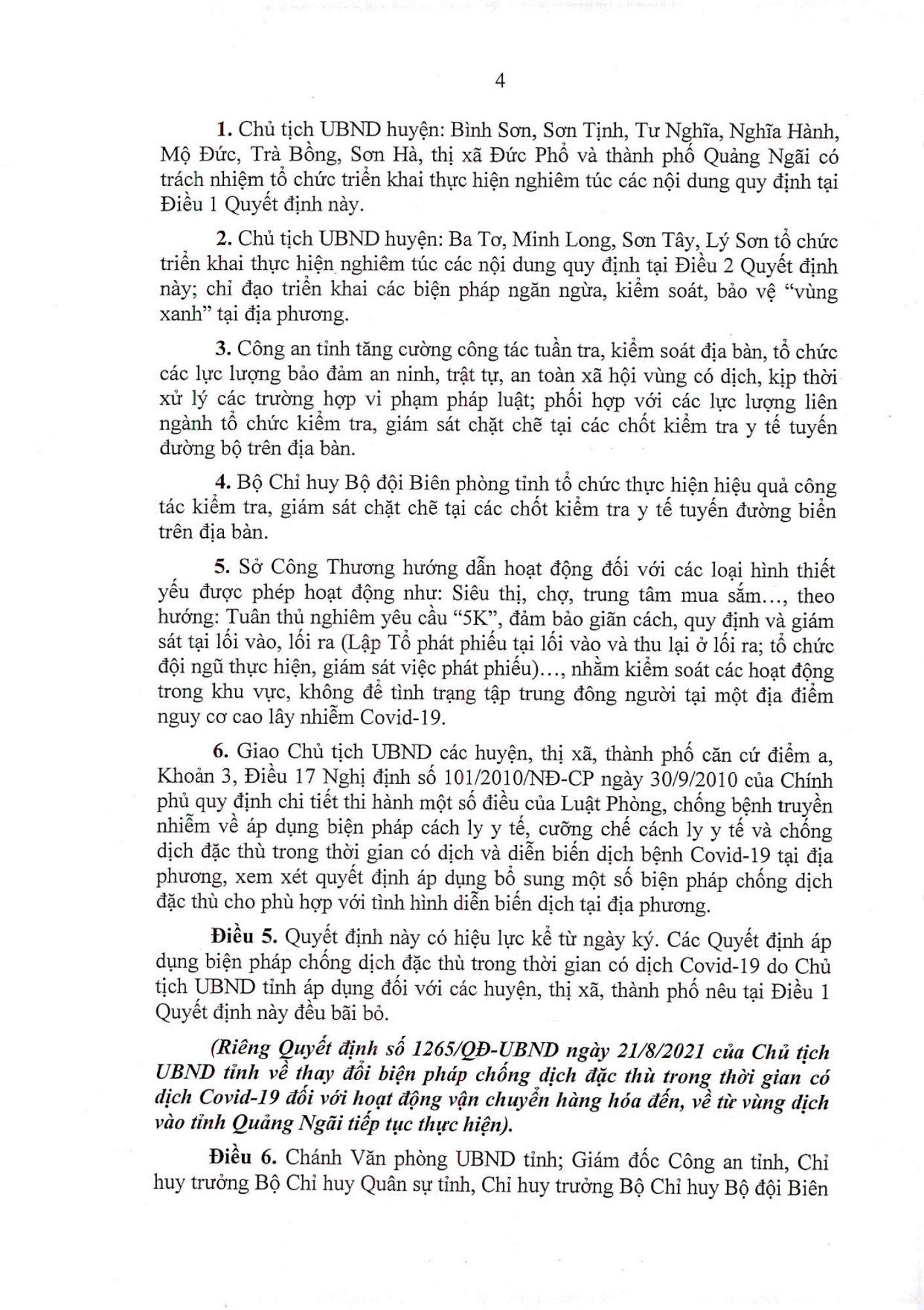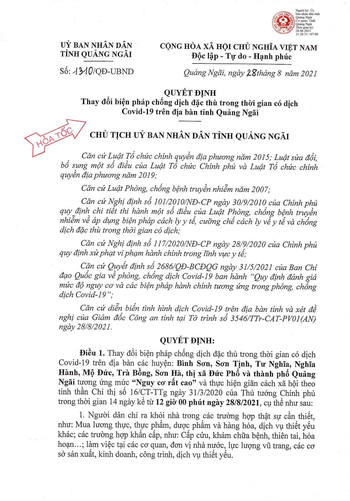 Sáng 28/8, Chủ tịch UBND tỉnh Quảng Ngãi Đặng Văn Minh đã ký Quyết định hỏa tốc về việc thay đổi các biện pháp phòng chống dịch đặc thù trong thời gian có dịch Covid-19 trên địa bàn một số quận huyện.