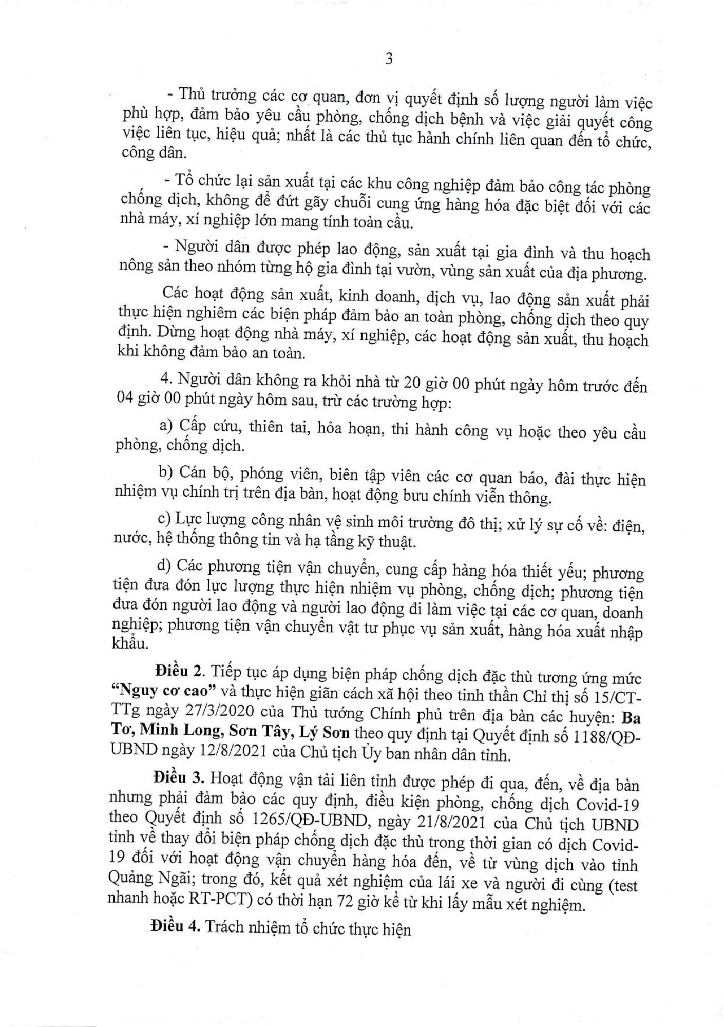 Theo đó, các quận huyện gồm Bình Sơn, Sơn Tịnh, Tư Nghĩa, Nghĩa Hành, Mộ Đức, Trà Bồng, Sơn Hà, thị xã Đức Phổ và TP.Quảng Ngãi, tương ứng mức “nguy cơ rất cao” và thực hiện giãn cách xã hội theo Chỉ thị 16/CT-TTg ngày 31/3/2020 của Thủ tướng Chính phủ trong thời gian 14 ngày kể từ 12 giờ ngày 28/8/2021.