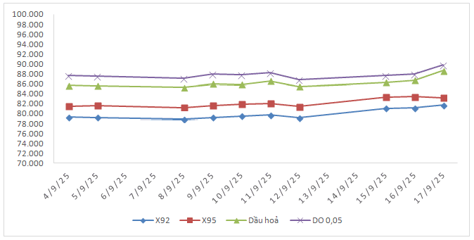 Bình quân giá thành phẩm xăng dầu thế giới giữa kỳ điều hành giá ngày 11/9/2025 và kỳ điều hành ngày 18/9/2025 là: 80,554 USD/thùng xăng RON92 dùng để pha chế xăng E5RON92 (tăng 1,336 USD/thùng, tương đương tăng 1,69%); 82,676 USD/thùng xăng RON95 (tăng 1,136 USD/thùng, tương đương tăng 1,39%); 86,712 USD/thùng dầu hỏa (tăng 1,082 USD/thùng, tương đương tăng 1,26%); 88,078 USD/thùng dầu điêzen 0,05S (tăng 0,434 USD/thùng, tương đương tăng 0,50%); 401,586 USD/tấn dầu mazut 180CST 3,5S (tăng 1,818 USD/tấn, tương đương tăng 0,45%).