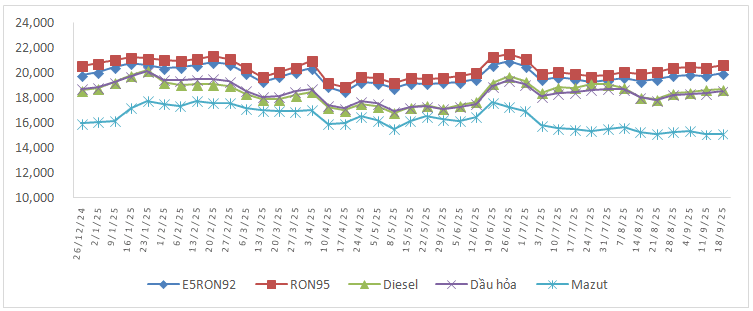 Biến động giá bán xăng dầu trong nước năm 2025 (26/12/2024 đến 18/9/2025)